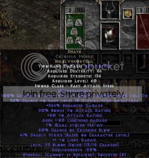 The other two deaths were just stupidity on my part. In Hell, I was poisoned really badly and walking around and I thought I’d TP back to town and talk to Ormus instead of using a Rejuv potion. I was dawdling around picking up some loot before I went through the portal and not paying attention to the quick drain, and the poison killed me before I walked through the portal.